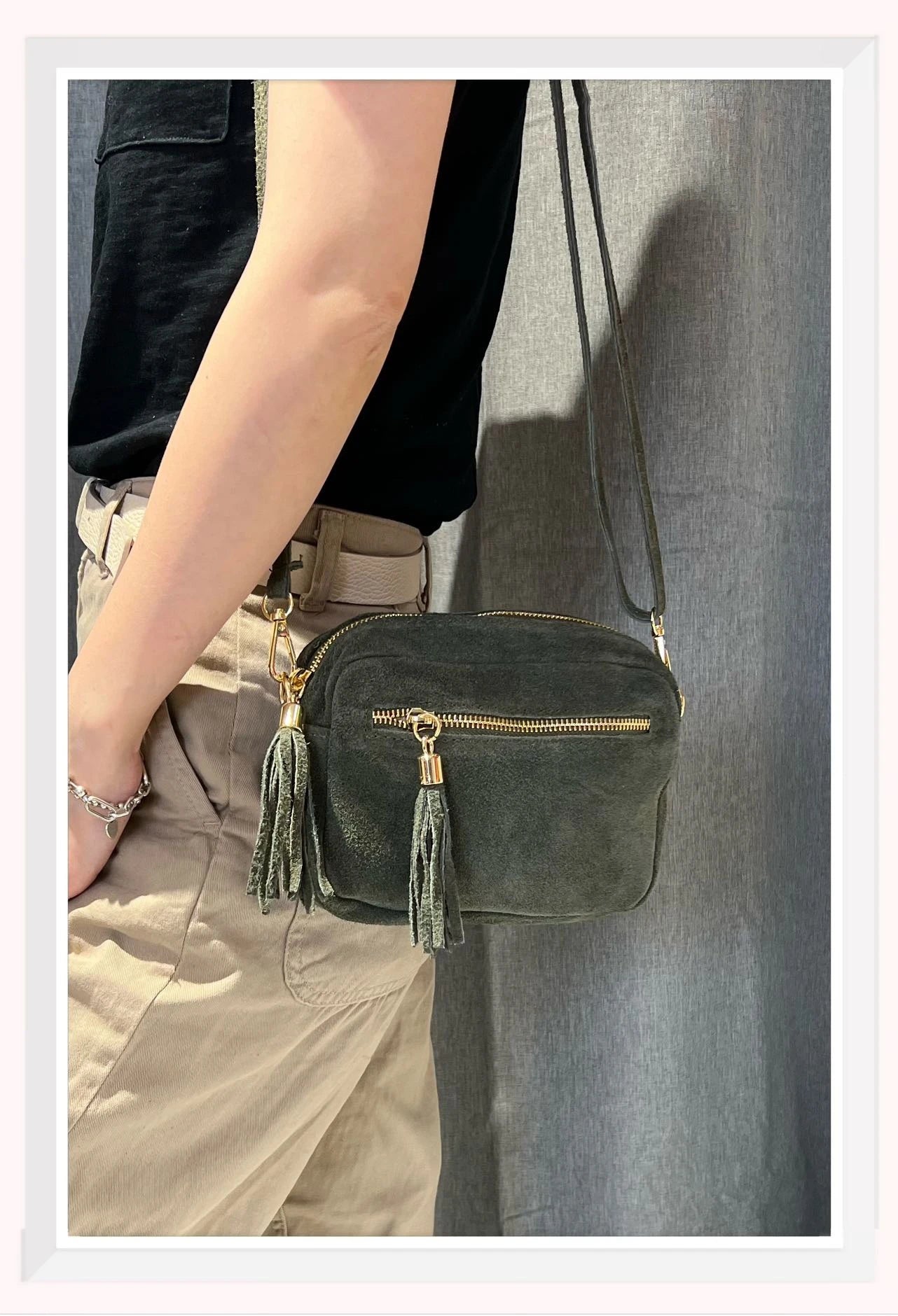 Sac à bandoulière en Daim, une poche sur façade à fermeture éclair et une poche intérieur.