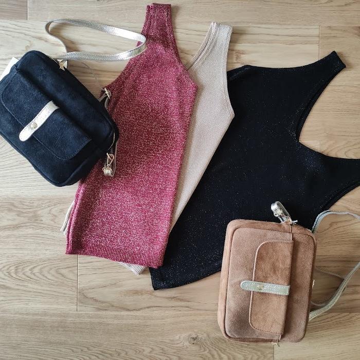 Top en maille avec fil or/ Irisé , à large bretelles . Il viendra rehaussé vos tenue par son coté chic.